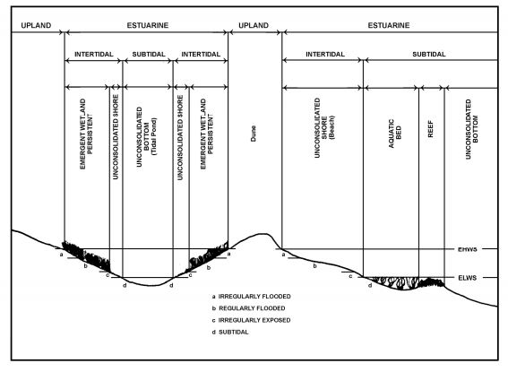Classes: Rock Bottom, Unconsolidated Bottom, Aquatic Bed, Reef, Streambed, Rocky Shore, Unconsolidated Shore, Emergent Wetland, Scrub-Shrub Wetland, and Forested Wetland.