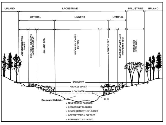 Littoral (2): This subsystem includes all wetland habitats in the Lacustrine System. It extends from the shoreward boundary of the System to a depth of 2.5 m (8.2 ft) below low water, or to the maximum extent of nonpersistent emergents if these grow at depths greater than 2.5 m.