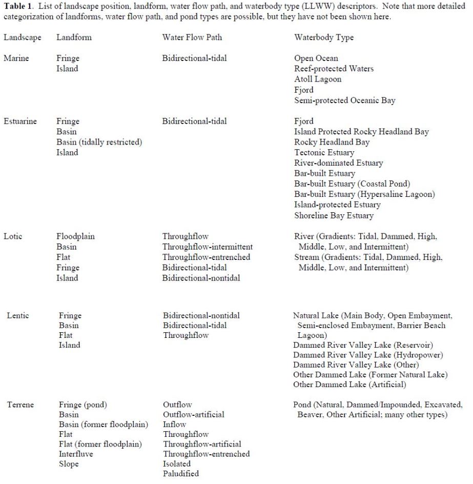 Recognizing the need to better describe wetlands from the abiotic standpoint in the spirit of the HGM approach, the Service developed a set of dichotomous keys for use with NWI data (Tiner 1997b). The keys bridge the gap between the Service's wetland classification and the HGM system by providing descriptors for landscape position, landform, water flow path and waterbody type (LLWW descriptors) important for producing better characterizations of wetlands and deepwater habitats. The LLWW descriptors for wetlands can be easily correlated with the HGM types to make use of HGM profiles when they become available. The LLWW attributes were designed chiefly as descriptors for the Service's existing classification system (Cowardin et al. 1979) and to be applied to NWI digital data, but they can be used independently to describe a wetland or deepwater habitat. Consequently, there is some overlap with Cowardin et al. since some users may wish to use these descriptors without reference to Cowardin et al.